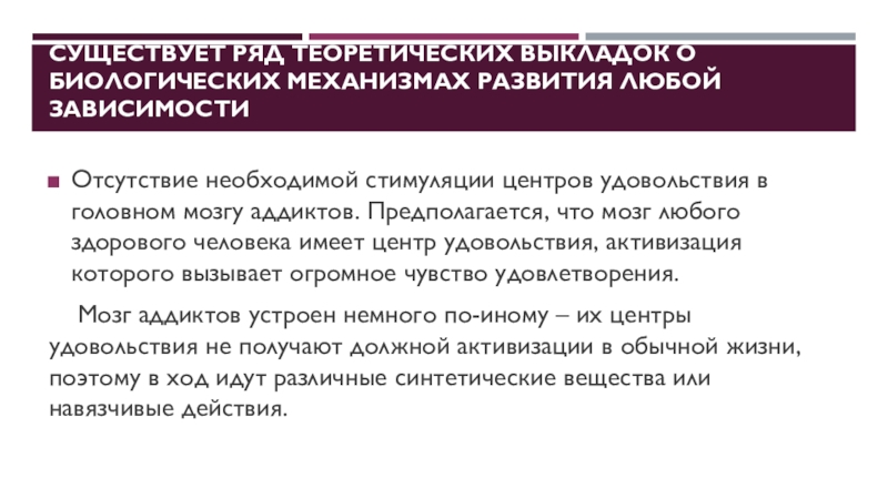 Слайд 4Существует ряд теоретических выкладок о биологических механизмах развития любой зависимости