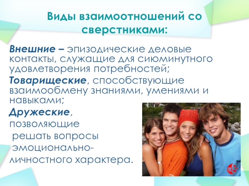 Виды взаимоотношений со сверстниками: