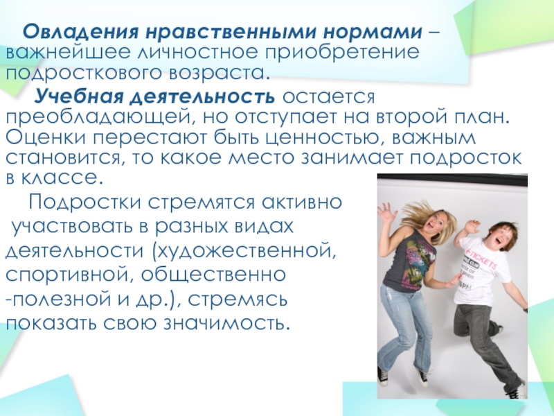 Слайд 8 Овладения нравственными нормами – важнейшее личностное приобретение подросткового возраста.