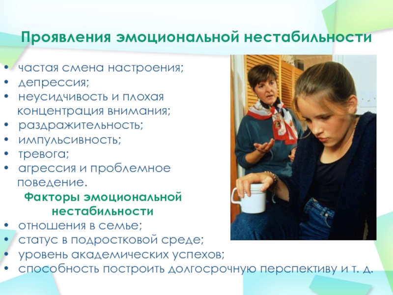 Слайд 4Проявления эмоциональной нестабильности