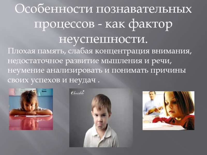 Слайд 14Особенности познавательных процессов - как фактор неуспешности.