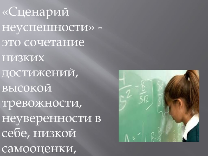 Слайд 18«Сценарий неуспешности» - это сочетание низких достижений, высокой тревожности, неуверенности в