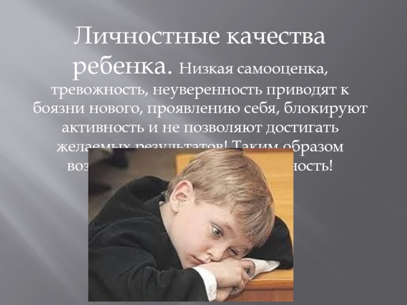 Слайд 12Личностные качества ребенка. Низкая самооценка, тревожность, неуверенность приводят к боязни нового,