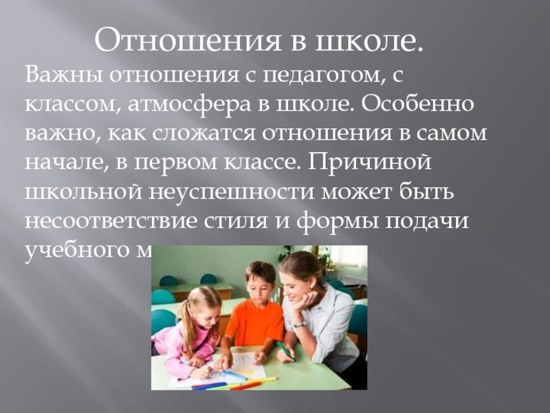 школе. Особенно важно, как сложатся отношения в самом начале, в первом классе. Причиной школьной неуспешности может быть несоответствие стиля и формы подачи учебного материала.