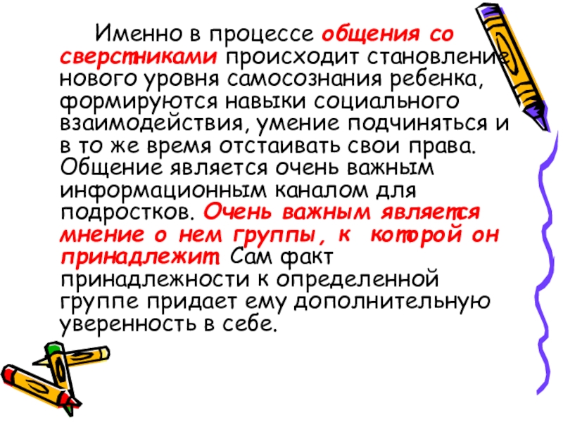 нового уровня самосознания ребенка, формируются навыки социального взаимодействия, умение подчиняться и в то же время отстаивать свои права. Общение является очень важным информационным каналом для подростков. Очень важным является мнение о нем группы, к которой он принадлежит. Сам факт принадлежности к определенной группе придает ему дополнительную уверенность в себе.