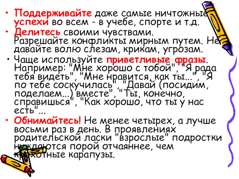 Обнимайтесь! Не менее четырех, а лучше восьми раз в день. В проявлениях родительской ласки "взрослые" подростки нуждаются порой отчаяннее, чем крохотные карапузы.