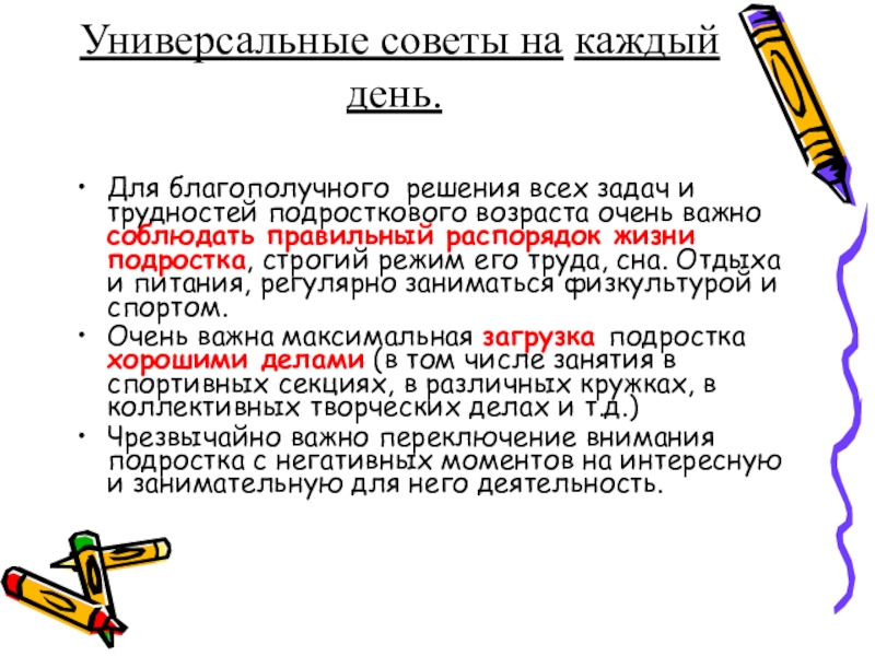 Очень важна максимальная загрузка подростка хорошими делами (в том числе занятия в спортивных секциях, в различных кружках, в коллективных творческих делах и т.д.)