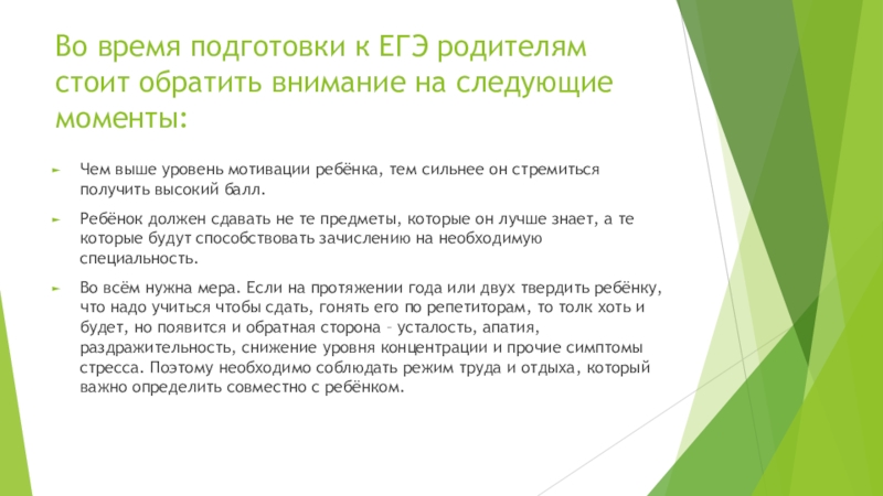Во всём нужна мера. Если на протяжении года или двух твердить ребёнку, что надо учиться чтобы сдать, гонять его по репетиторам, то толк хоть и будет, но появится и обратная сторона – усталость, апатия, раздражительность, снижение уровня концентрации и прочие симптомы стресса. Поэтому необходимо соблюдать режим труда и отдыха, который важно определить совместно с ребёнком.