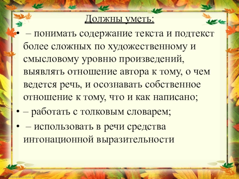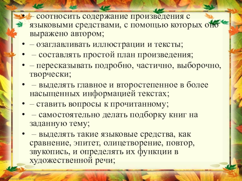 Слайд 13– соотносить содержание произведения с языковыми средствами, с помощью которых оно