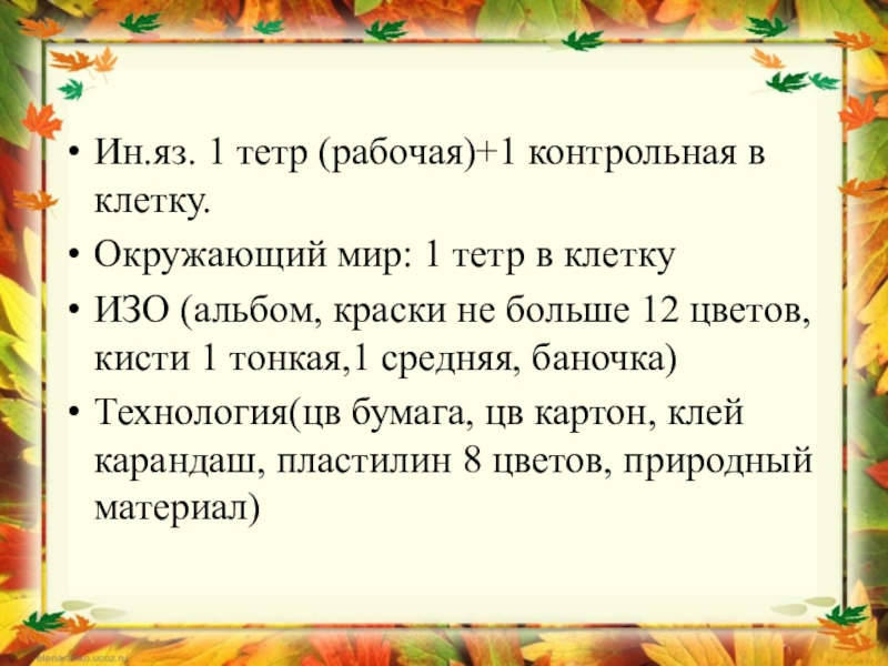 ИЗО (альбом, краски не больше 12 цветов, кисти 1 тонкая,1 средняя, баночка)
