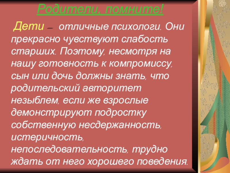 Поэтому, несмотря на нашу готовность к компромиссу, сын или дочь должны знать, что родительский авторитет незыблем, если же взрослые демонстрируют подростку собственную несдержанность, истеричность, непоследовательность, трудно ждать от него хорошего поведения.