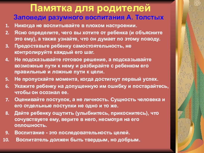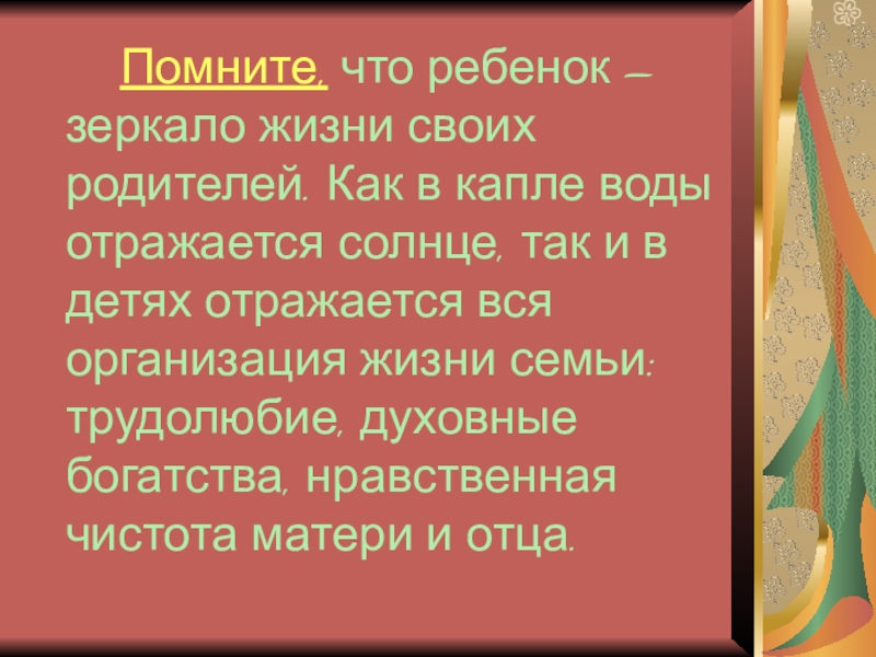 Слайд 7 Помните, что ребенок – зеркало жизни своих родителей. Как в капле