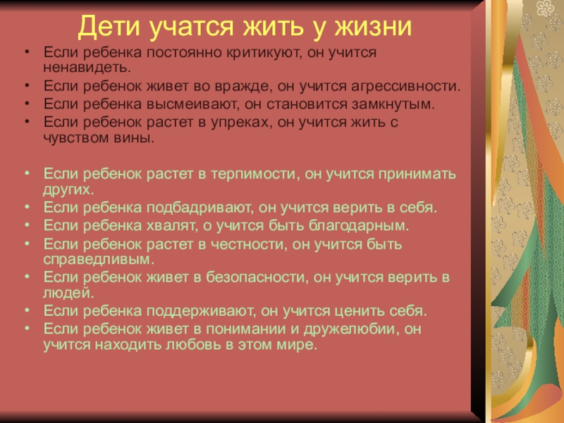 Если ребенок живет в понимании и дружелюбии, он учится находить любовь в этом мире.
