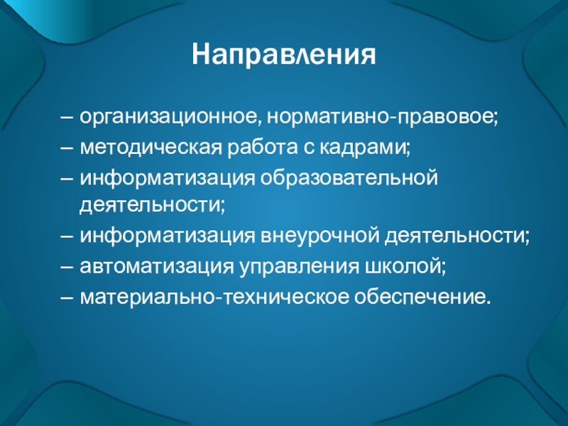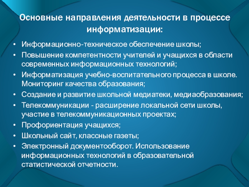 Слайд 4Основные направления деятельности в процессе информатизации: