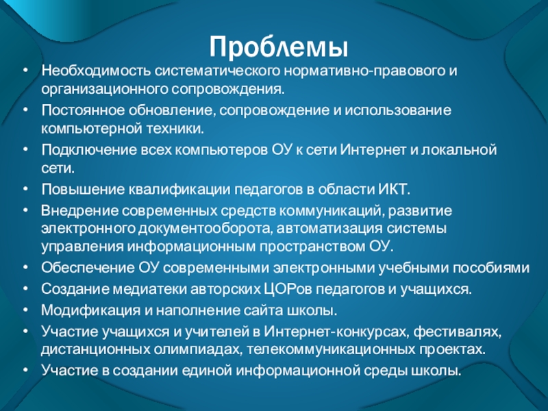 Внедрение современных средств коммуникаций, развитие электронного документооборота, автоматизация системы управления информационным пространством ОУ.