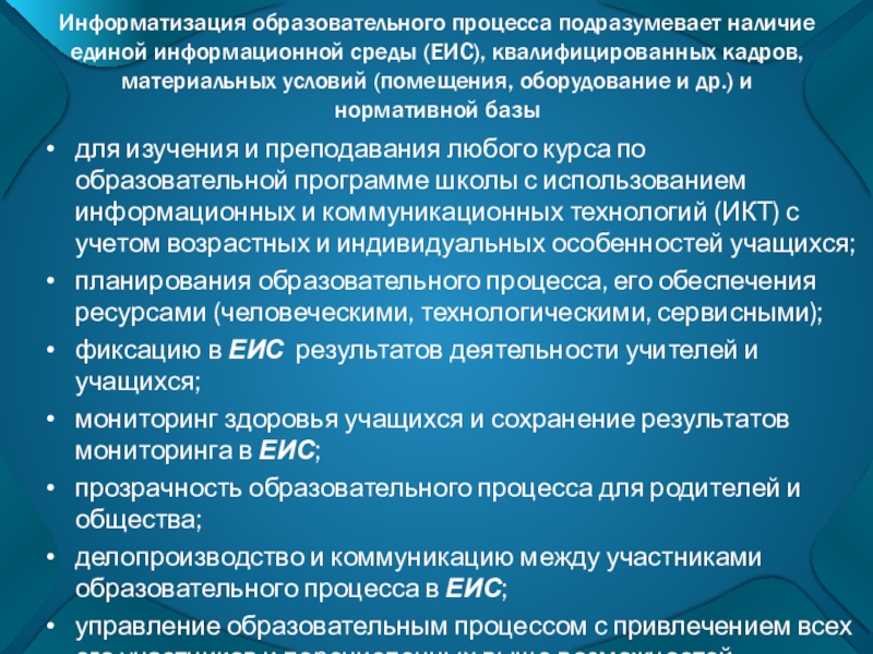 Слайд 7Информатизация образовательного процесса подразумевает наличие единой информационной среды (ЕИС), квалифицированных кадров,