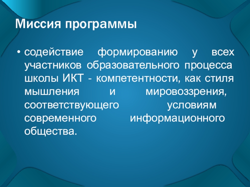 - компетентности, как стиля мышления и мировоззрения, соответствующего условиям современного информационного общества.