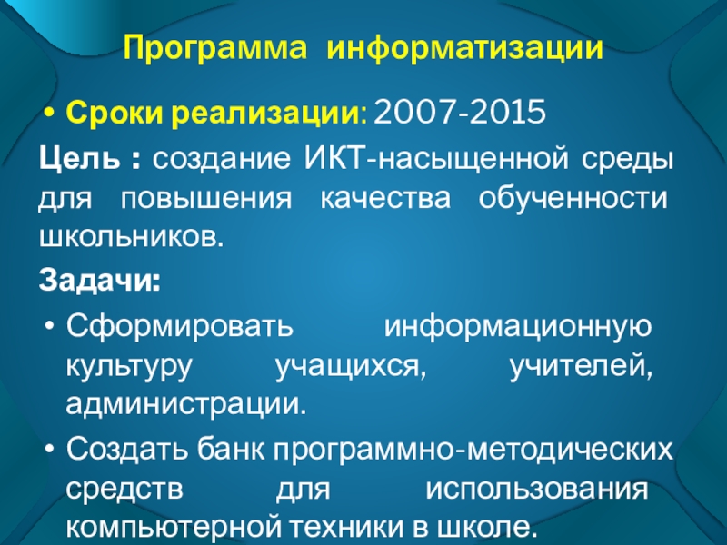Создать банк программно-методических средств для использования компьютерной техники в школе.