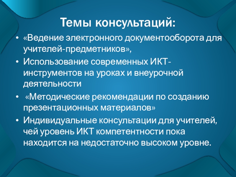 Индивидуальные консультации для учителей, чей уровень ИКТ компетентности пока находится на недостаточно высоком уровне.