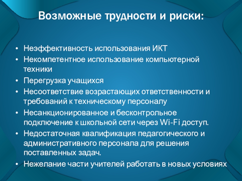 Недостаточная квалификация педагогического и административного персонала для решения поставленных задач.