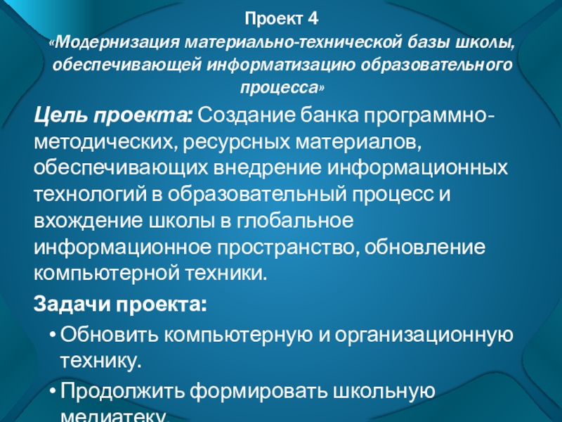 банка программно-методических, ресурсных материалов, обеспечивающих внедрение информационных технологий в образовательный процесс и вхождение школы в глобальное информационное пространство, обновление компьютерной техники.