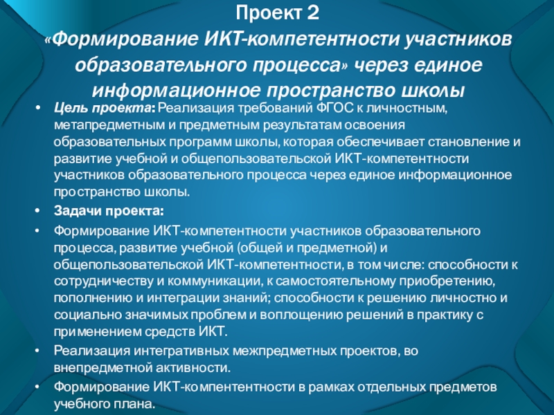 проекта: Реализация требований ФГОС к личностным, метапредметным и предметным результатам освоения образовательных программ школы, которая обеспечивает становление и развитие учебной и общепользовательской ИКТ-компетентности участников образовательного процесса через единое информационное пространство школы.