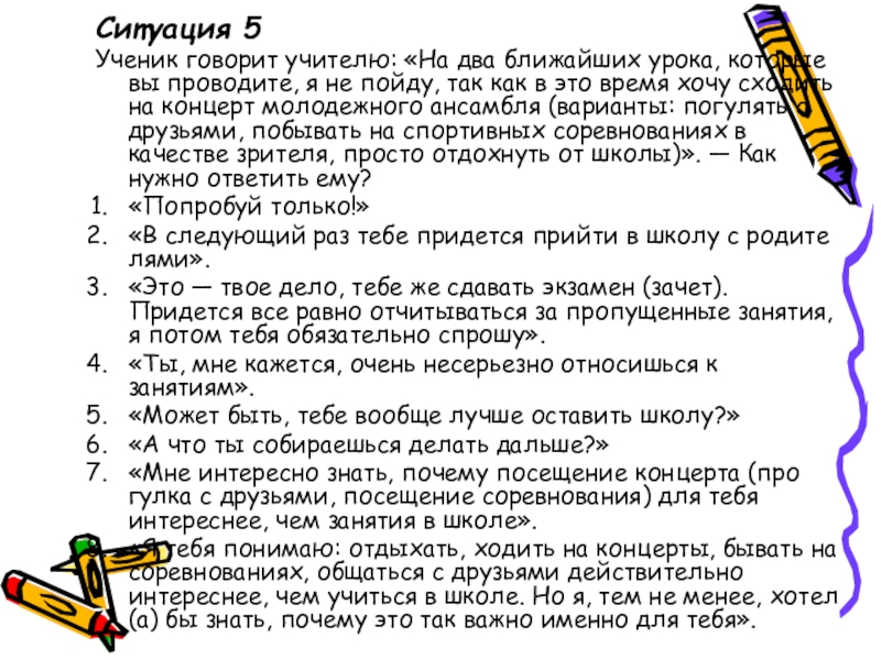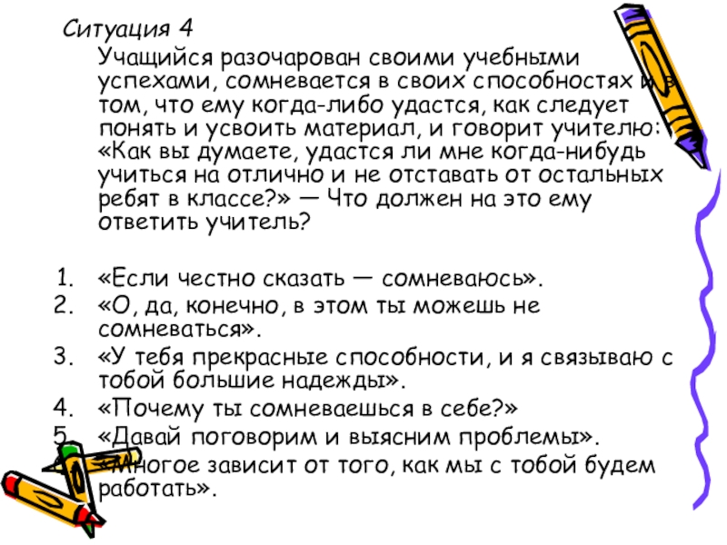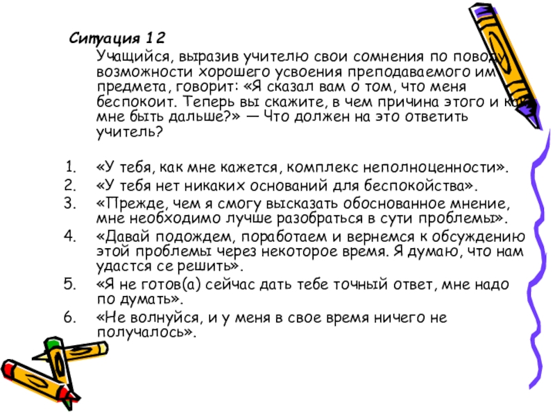 преподаваемого им предмета, говорит: «Я сказал вам о том, что меня беспокоит. Теперь вы скажите, в чем причина этого и как мне быть дальше?» — Что должен на это ответить учитель?