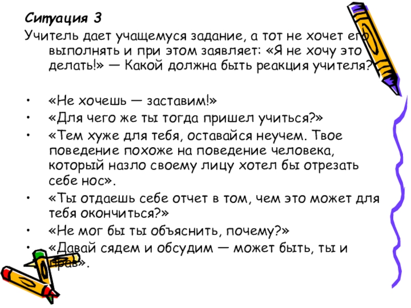 и при этом заявляет: «Я не хочу это делать!» — Какой должна быть реакция учителя?