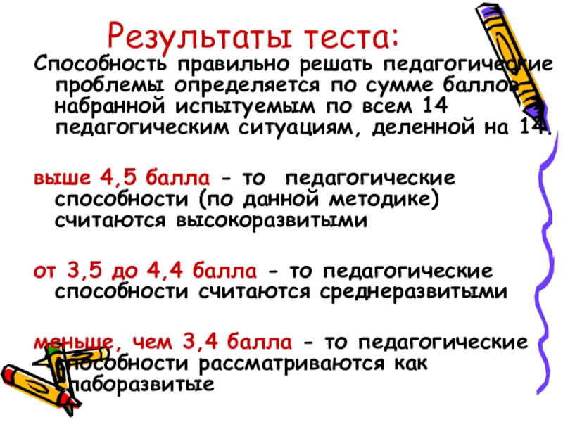 выше 4,5 балла - то педагогические способности (по данной методике) считаются высокоразвитыми