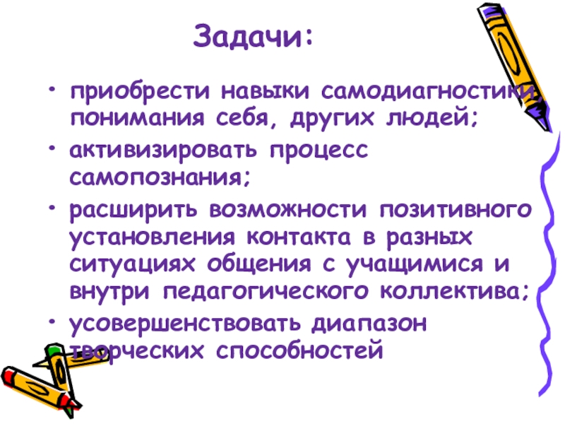 приобрести навыки самодиагностики, понимания себя, других людей;