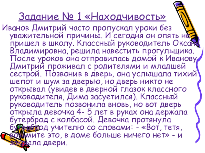И сегодня он опять не пришел в школу. Классный руководитель Оксана Владимировна, решила навестить прогульщика. После уроков она отправилась домой к Иванову. Дмитрий проживал с родителями и младшей сестрой. Позвонив в дверь, она услышала тихий шепот и шум за дверью, но дверь никто не открывал (увидев в дверной глазок классного руководителя, Дима засуетился). Классный руководитель позвонила вновь, но вот дверь открыла девочка 4- 5 лет в руках она держала бутерброд с колбасой. Девочка протянула бутерброд учителю со словами: - «Вот, тетя, возьмите это, в доме больше ничего нет» - и закрыла двери.