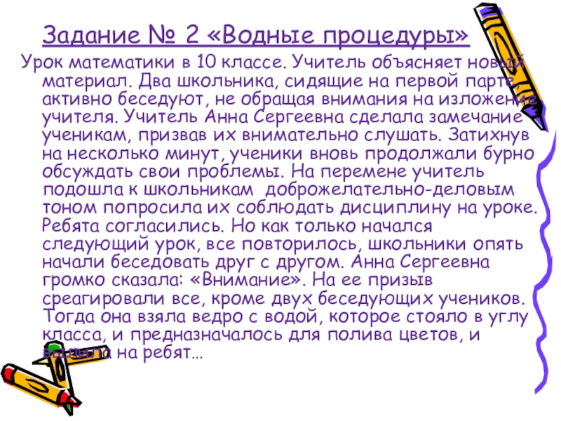 новый материал. Два школьника, сидящие на первой парте, активно беседуют, не обращая внимания на изложение учителя. Учитель Анна Сергеевна сделала замечание ученикам, призвав их внимательно слушать. Затихнув на несколько минут, ученики вновь продолжали бурно обсуждать свои проблемы. На перемене учитель подошла к школьникам доброжелательно-деловым тоном попросила их соблюдать дисциплину на уроке. Ребята согласились. Но как только начался следующий урок, все повторилось, школьники опять начали беседовать друг с другом. Анна Сергеевна громко сказала: «Внимание». На ее призыв среагировали все, кроме двух беседующих учеников. Тогда она взяла ведро с водой, которое стояло в углу класса, и предназначалось для полива цветов, и вылила на ребят…