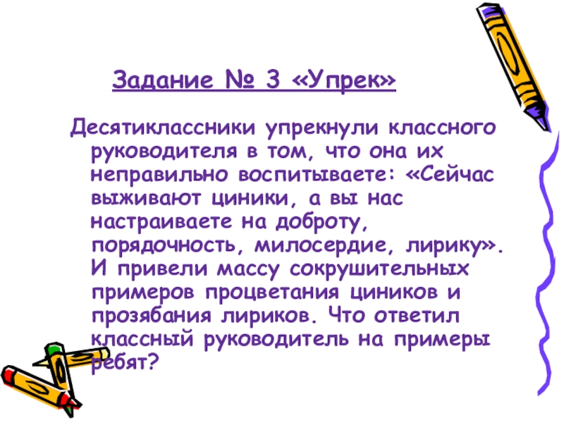 их неправильно воспитываете: «Сейчас выживают циники, а вы нас настраиваете на доброту, порядочность, милосердие, лирику». И привели массу сокрушительных примеров процветания циников и прозябания лириков. Что ответил классный руководитель на примеры ребят?
