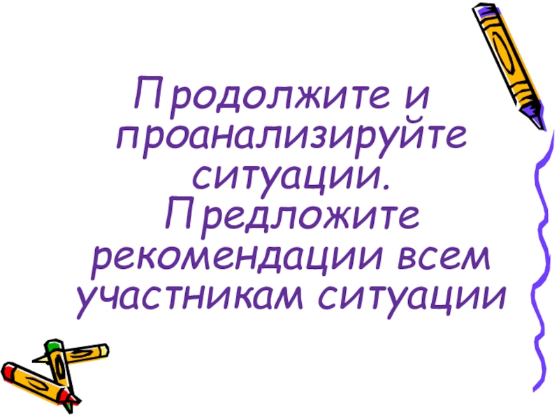 Слайд 9Продолжите и проанализируйте ситуации. Предложите рекомендации всем участникам ситуации
