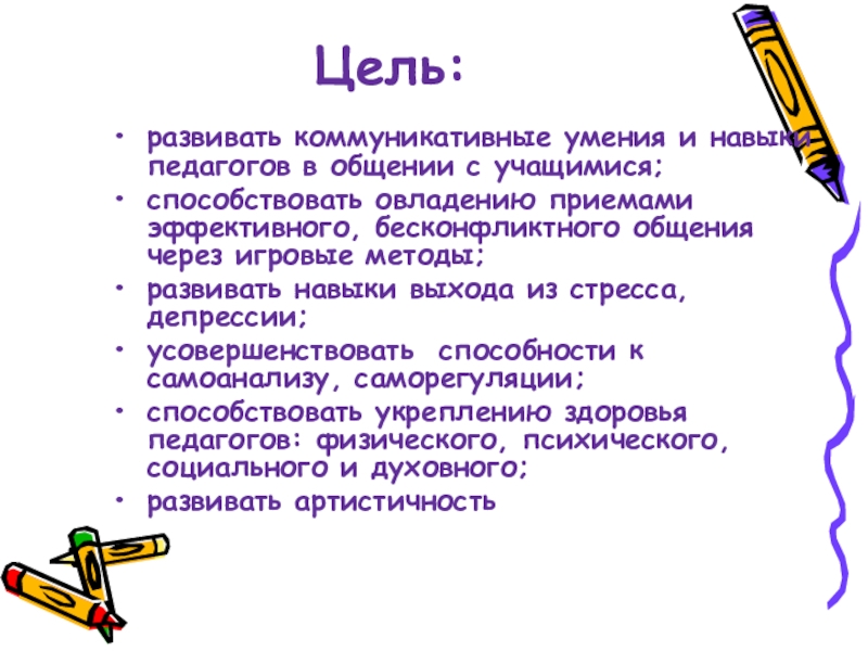 овладению приемами эффективного, бесконфликтного общения через игровые методы;