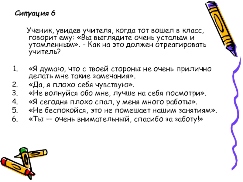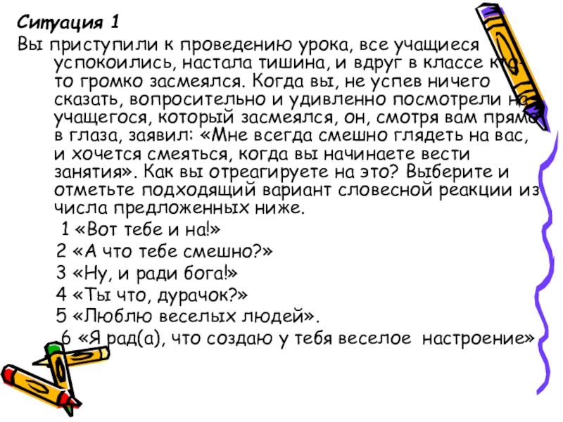 и вдруг в классе кто-то громко засмеялся. Когда вы, не успев ничего сказать, вопросительно и удивленно посмотрели на учащегося, который засмеялся, он, смотря вам прямо в глаза, заявил: «Мне всегда смешно глядеть на вас, и хочется смеяться, когда вы начинаете вести занятия». Как вы отреагируете на это? Выберите и отметьте подходящий вариант словесной реакции из числа предложенных ниже.