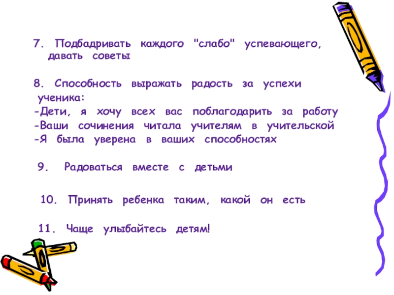 Слайд 317. Подбадривать каждого "слабо" успевающего, давать советы