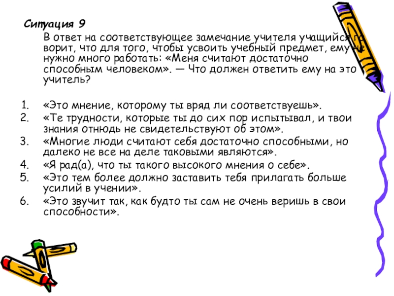 того, чтобы усвоить учебный предмет, ему не нужно много работать: «Меня считают достаточно способным человеком». — Что должен ответить ему на это учитель?