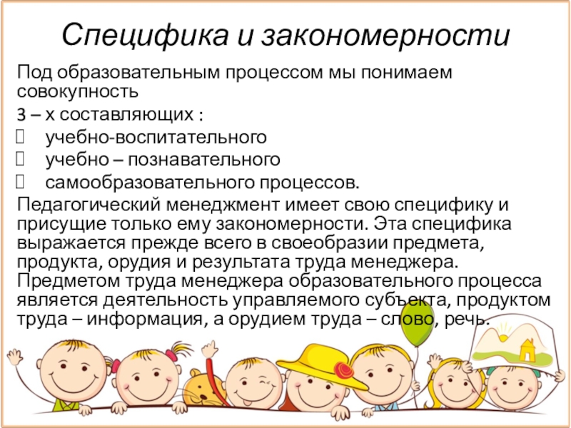 Педагогический менеджмент имеет свою специфику и присущие только ему закономерности. Эта специфика выражается прежде всего в своеобразии предмета, продукта, орудия и результата труда менеджера. Предметом труда менеджера образовательного процесса является деятельность управляемого субъекта, продуктом труда – информация, а орудием труда – слово, речь.