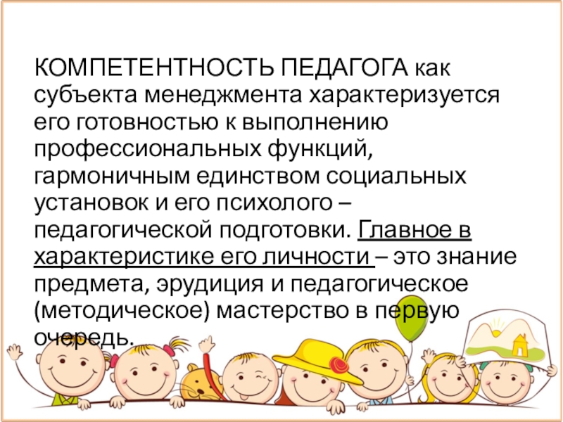 Слайд 8КОМПЕТЕНТНОСТЬ ПЕДАГОГА как субъекта менеджмента характеризуется его готовностью к выполнению профессиональных