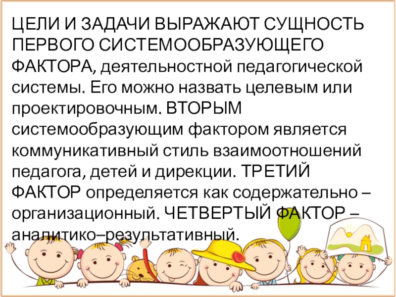 Слайд 14ЦЕЛИ И ЗАДАЧИ ВЫРАЖАЮТ СУЩНОСТЬ ПЕРВОГО СИСТЕМООБРАЗУЮЩЕГО ФАКТОРА, деятельностной педагогической системы.