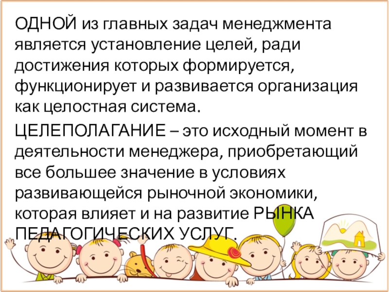 ЦЕЛЕПОЛАГАНИЕ – это исходный момент в деятельности менеджера, приобретающий все большее значение в условиях развивающейся рыночной экономики, которая влияет и на развитие РЫНКА ПЕДАГОГИЧЕСКИХ УСЛУГ.