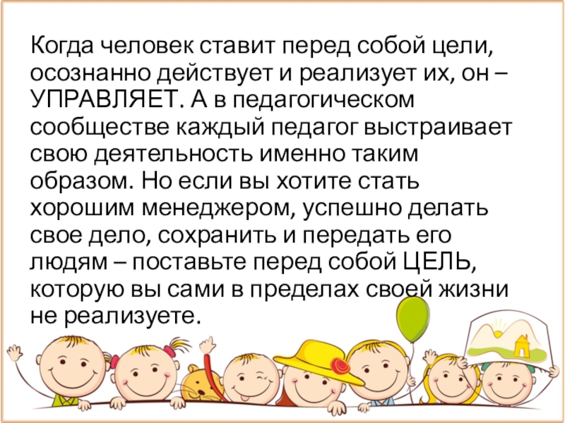 он – УПРАВЛЯЕТ. А в педагогическом сообществе каждый педагог выстраивает свою деятельность именно таким образом. Но если вы хотите стать хорошим менеджером, успешно делать свое дело, сохранить и передать его людям – поставьте перед собой ЦЕЛЬ, которую вы сами в пределах своей жизни не реализуете.