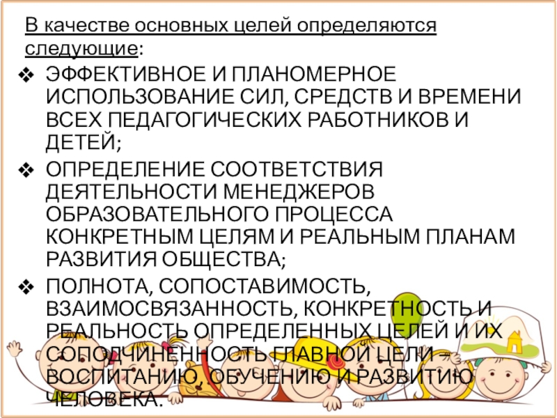 ПОЛНОТА, СОПОСТАВИМОСТЬ, ВЗАИМОСВЯЗАННОСТЬ, КОНКРЕТНОСТЬ И РЕАЛЬНОСТЬ ОПРЕДЕЛЕННЫХ ЦЕЛЕЙ И ИХ СОПОДЧИНЕННОСТЬ ГЛАВНОЙ ЦЕЛИ – ВОСПИТАНИЮ, ОБУЧЕНИЮ И РАЗВИТИЮ ЧЕЛОВЕКА.