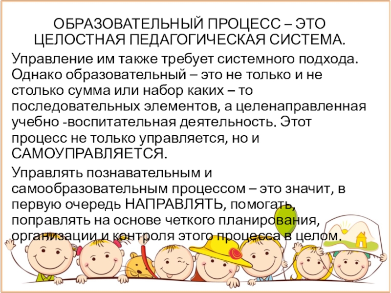 системного подхода. Однако образовательный – это не только и не столько сумма или набор каких – то последовательных элементов, а целенаправленная учебно -воспитательная деятельность. Этот процесс не только управляется, но и САМОУПРАВЛЯЕТСЯ.