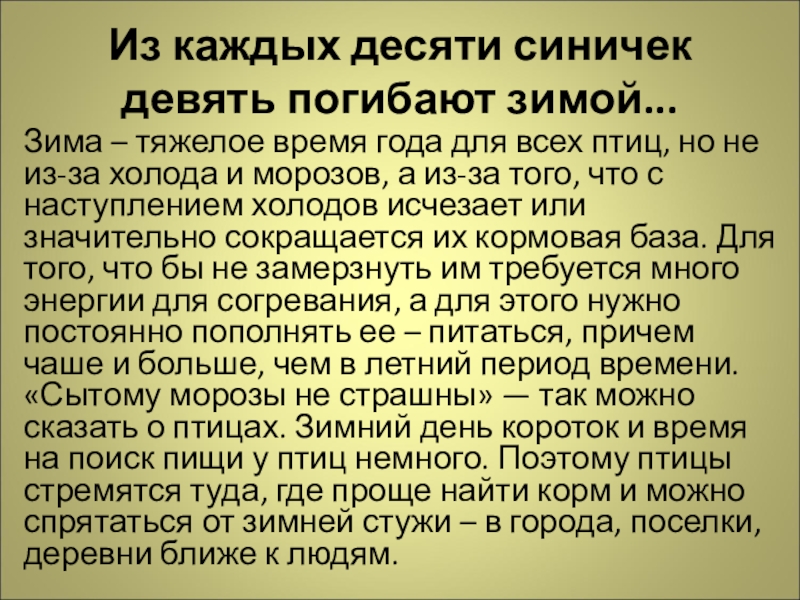 года для всех птиц, но не из-за холода и морозов, а из-за того, что с наступлением холодов исчезает или значительно сокращается их кормовая база. Для того, что бы не замерзнуть им требуется много энергии для согревания, а для этого нужно постоянно пополнять ее – питаться, причем чаше и больше, чем в летний период времени. «Сытому морозы не страшны» — так можно сказать о птицах. Зимний день короток и время на поиск пищи у птиц немного. Поэтому птицы стремятся туда, где проще найти корм и можно спрятаться от зимней стужи – в города, поселки, деревни ближе к людям.