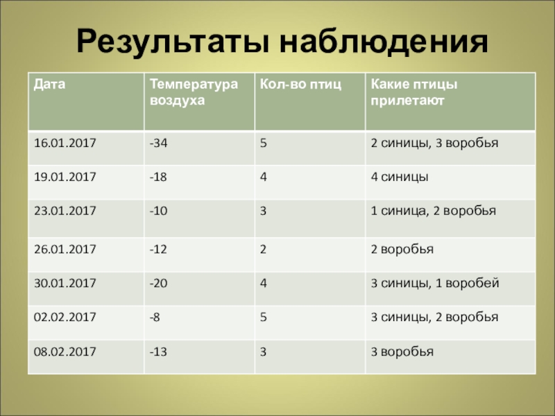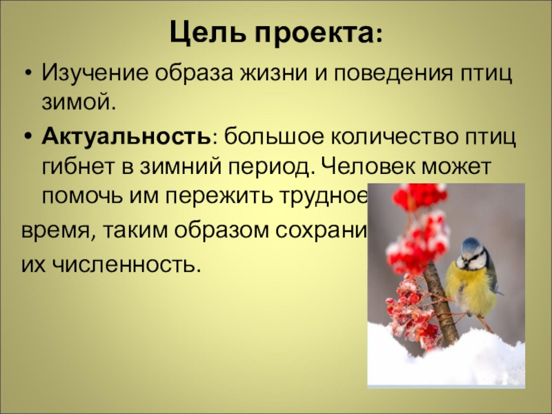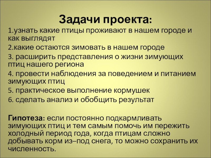Гипотеза: если постоянно подкармливать зимующих птиц и тем самым помочь им пережить холодный период года, когда птицам сложно добывать корм из–под снега, то можно сохранить их численность.