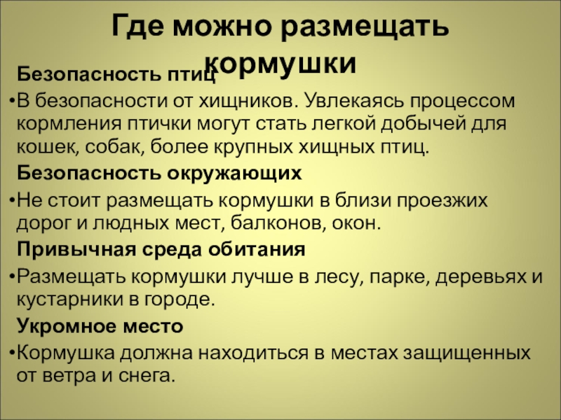 Кормушка должна находиться в местах защищенных от ветра и снега.
