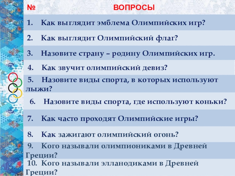 3. Назовите страну – родину Олимпийских игр.