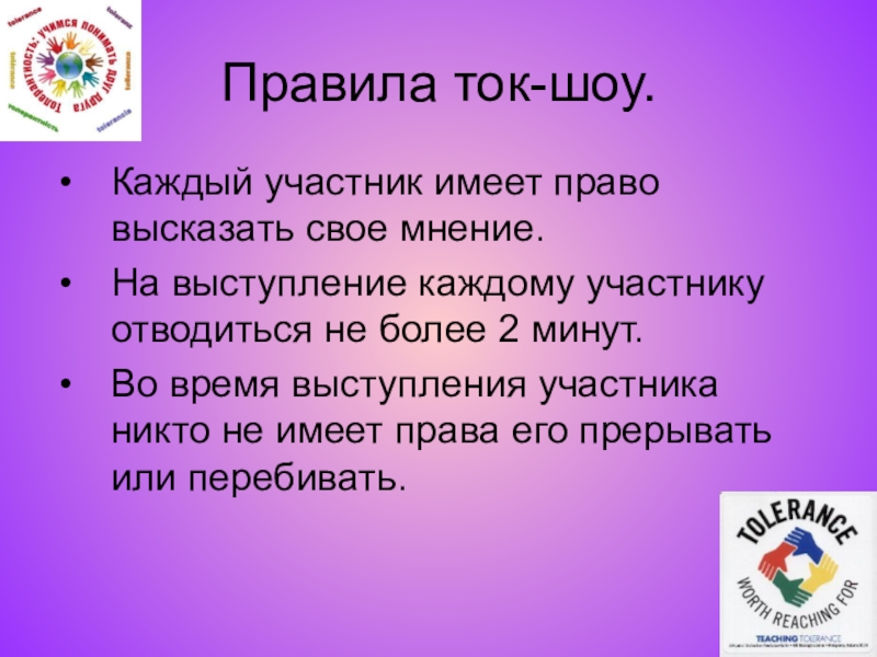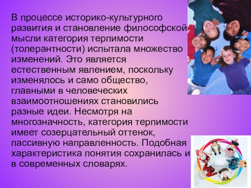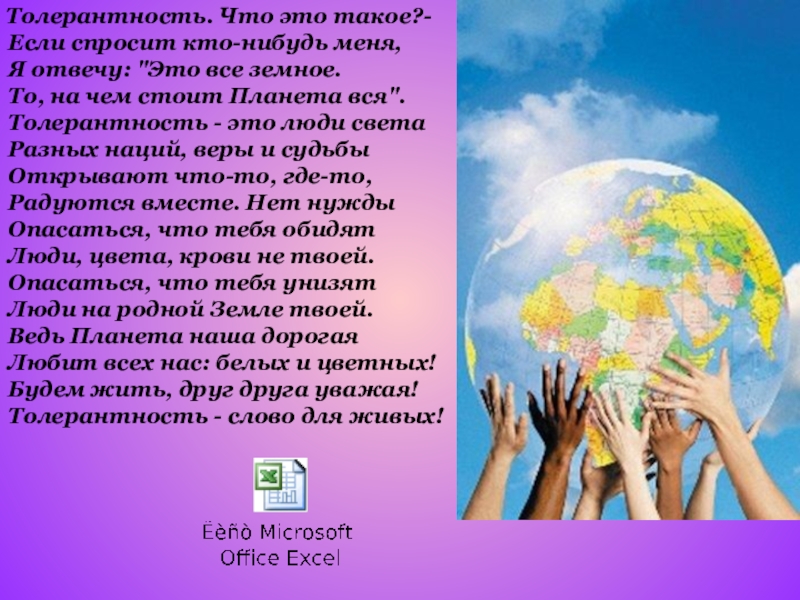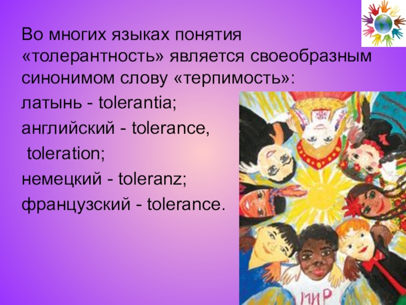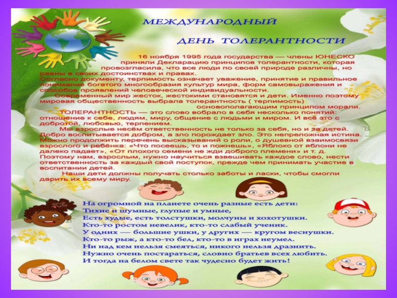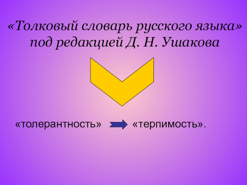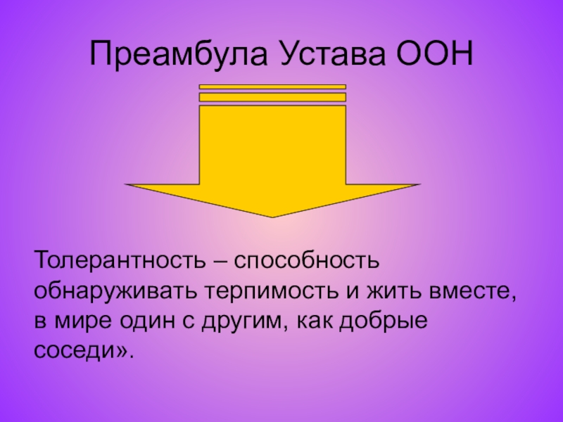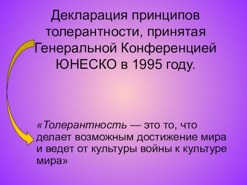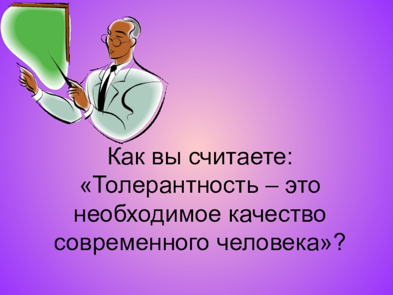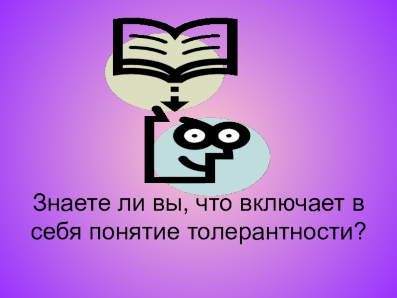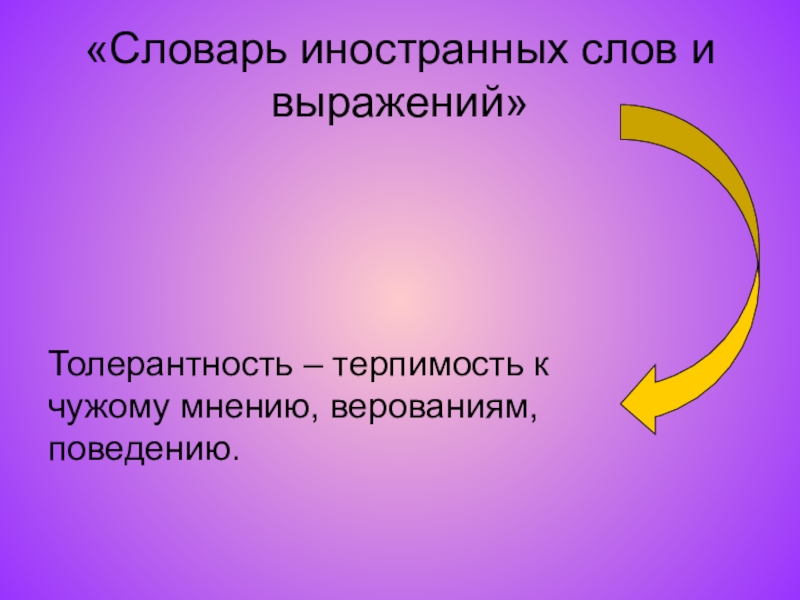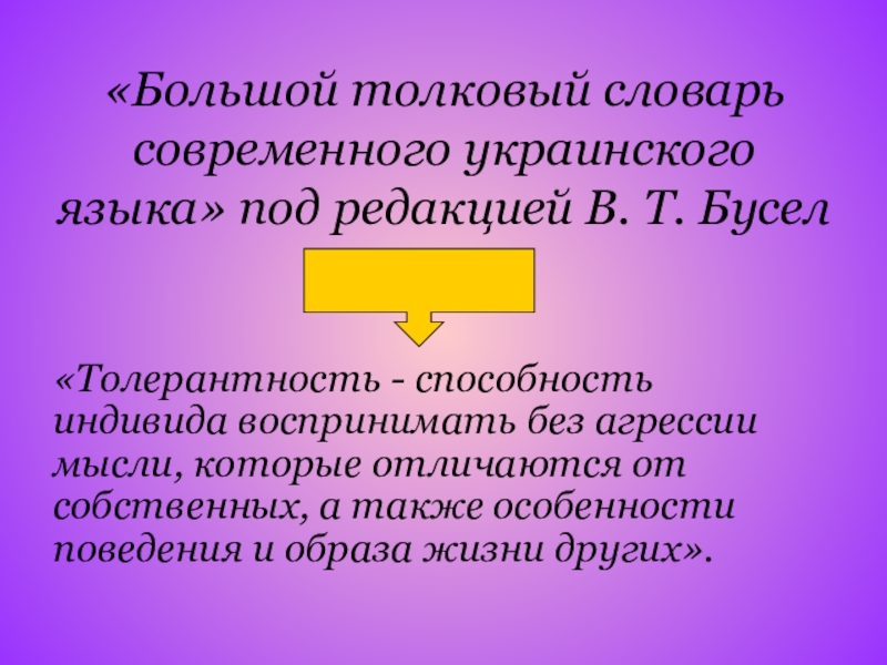 «Толерантность - способность индивида воспринимать без агрессии мысли, которые отличаются от собственных, а также особенности поведения и образа жизни других».